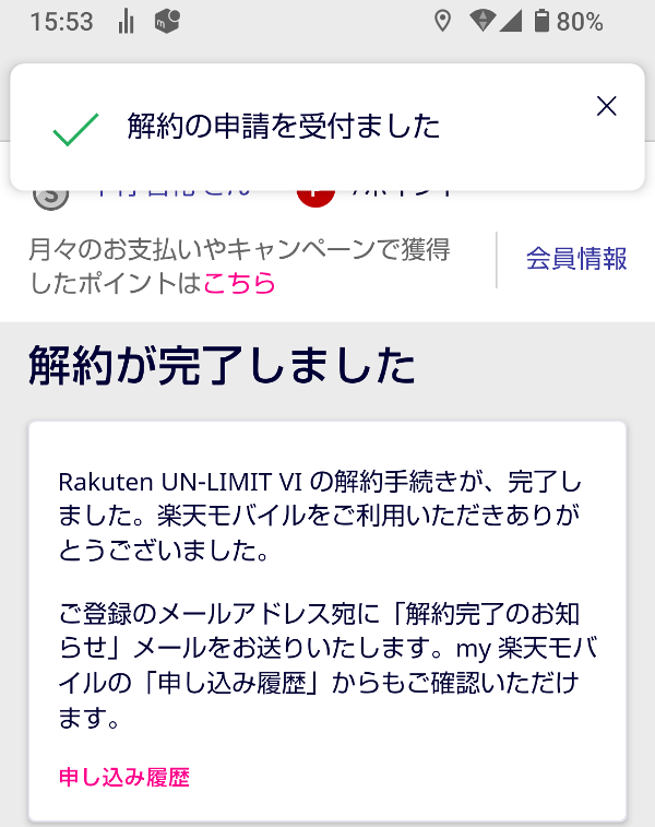 解約申込手続き完了後、数分後には「楽天モバイル」の解約を申し込んだ電話番号の画面が下のようになりました。 ほんと、楽天は手続きが早いです。